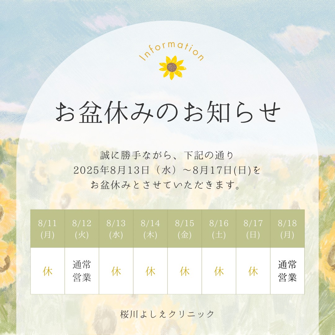 8月13日(火)~8月17日(日)の間、休診いたします。 ご不便おかけいたしますが、よろしくお願いいたします。 *美容ご予約のキャンセルやご変更希望の場合 8/18(月)予約されている方→8/12(月) 8/19(火)予約されている方→8/18(月) 8/20(水)予約されている方→8/18(月) 上記のお日にちまでにご連絡をお願いします。 上記日程以外でご予約いただいている方は、 通常ご案内している営業日3日前までにご連絡ください。