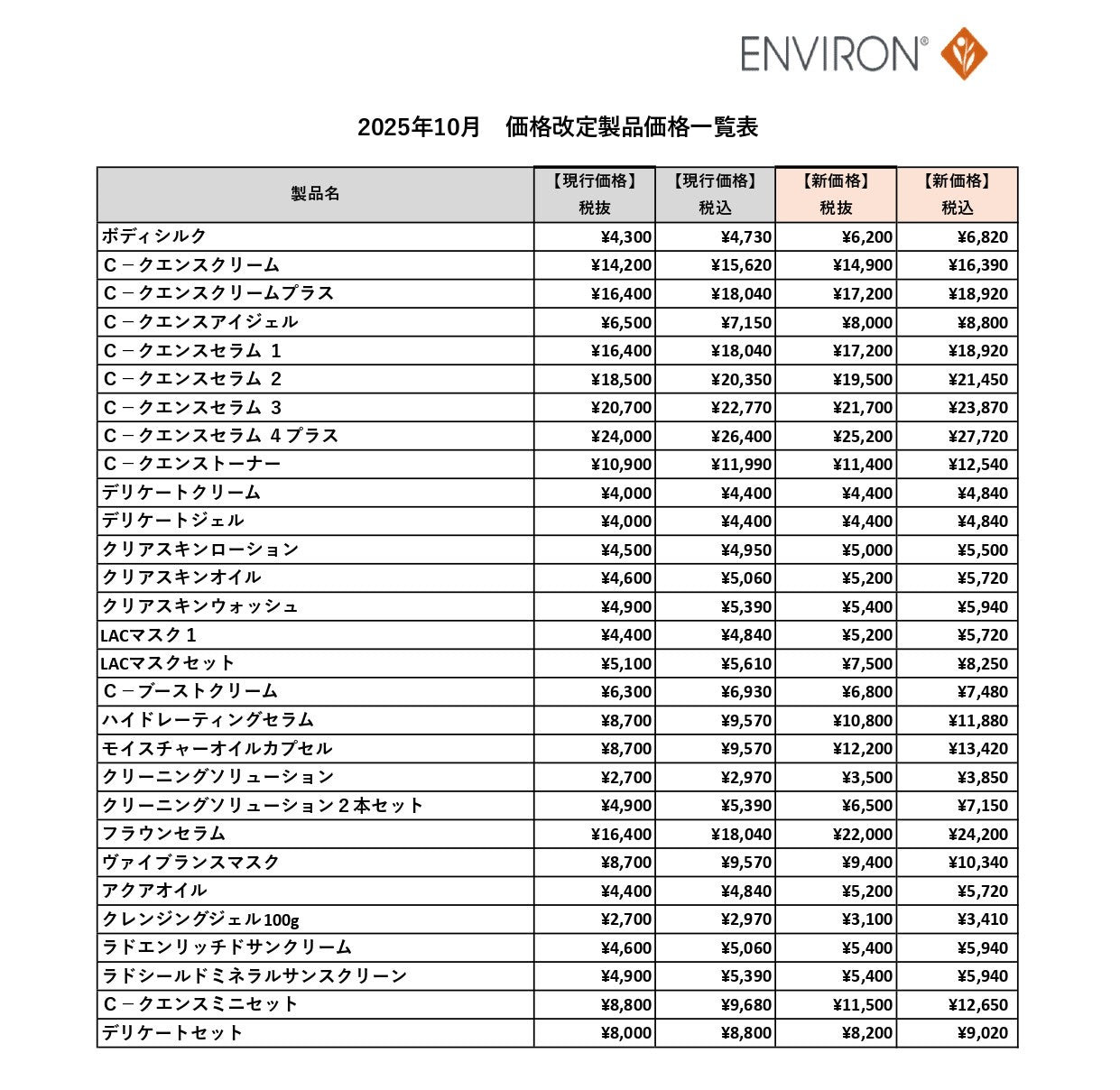 いつも桜川よしえクリニックをご愛顧いただき、誠にありがとうございます。 この度、メーカー様より、一部のエンビロン製品が2025年10月1日より値上げいたします。 ご来院時に在庫がない商品につきましては、商品代金を先払いしていただいてからの発注となりますので、 ご希望の方は、9月中にお買い求めくださいませ。