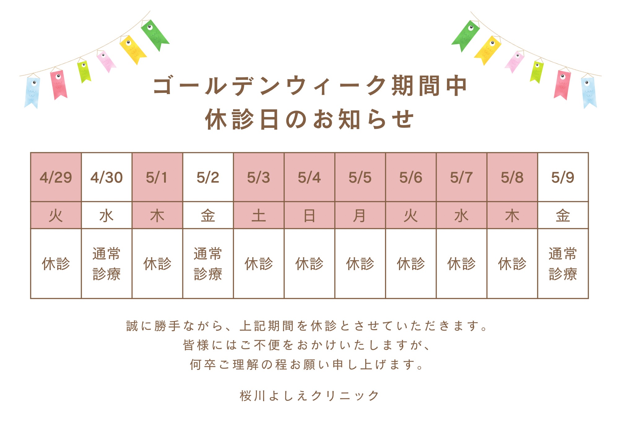 ゴールデンウィークの休診日について - 桜川よしえクリニック | 難波・桜川の美容皮膚科