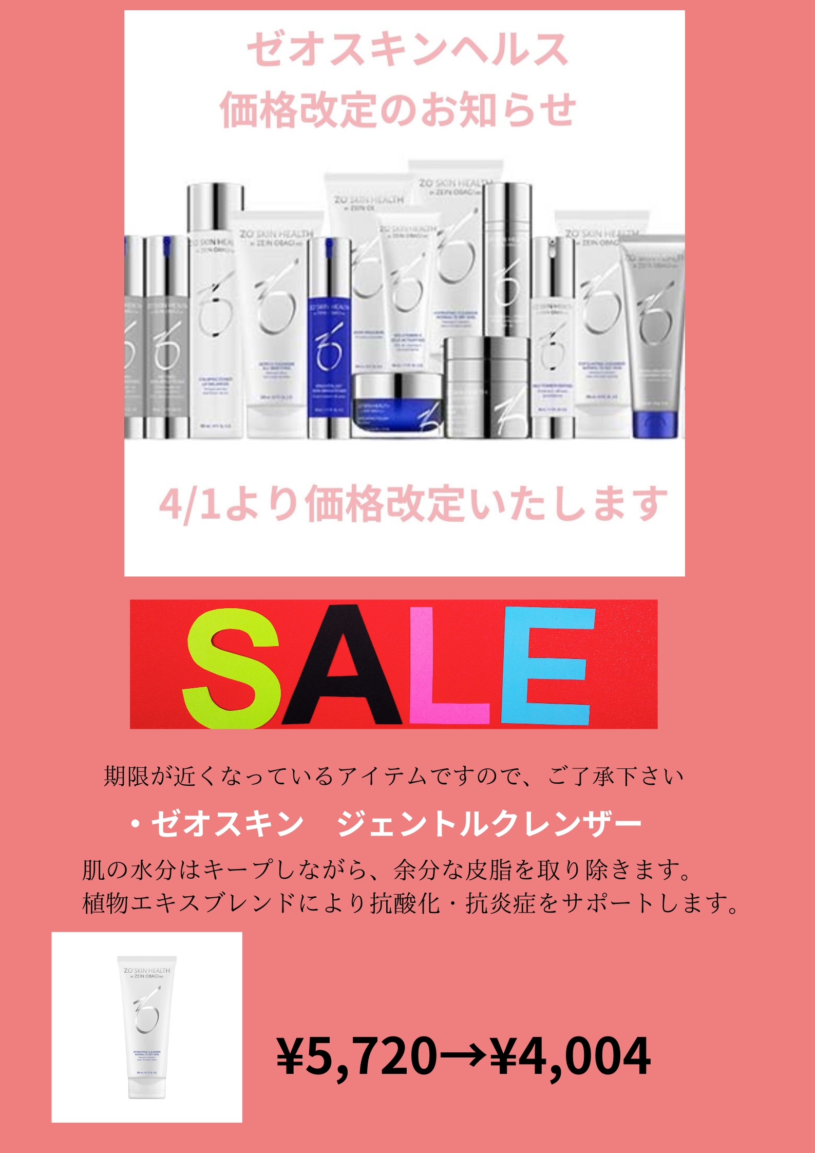 昨今の円安・物価高騰に伴い、ゼオスキン納入価格の値上がりに伴い、当院でも誠に恐縮ながら2025年4月1日より、ゼオスキンヘルスの一部商品の価格改定を行います。