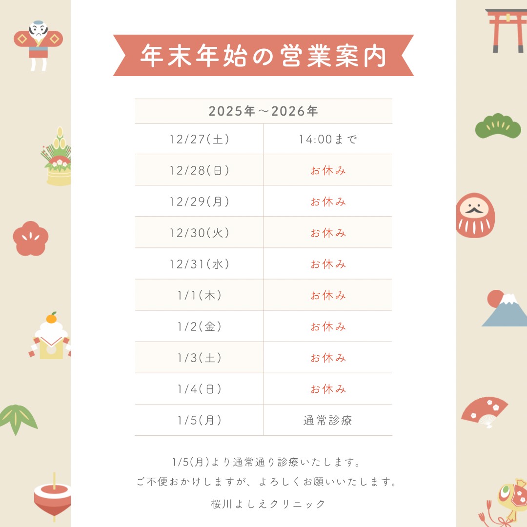 年末年始休診のお知らせ - 桜川よしえクリニック | 難波・桜川の美容皮膚科