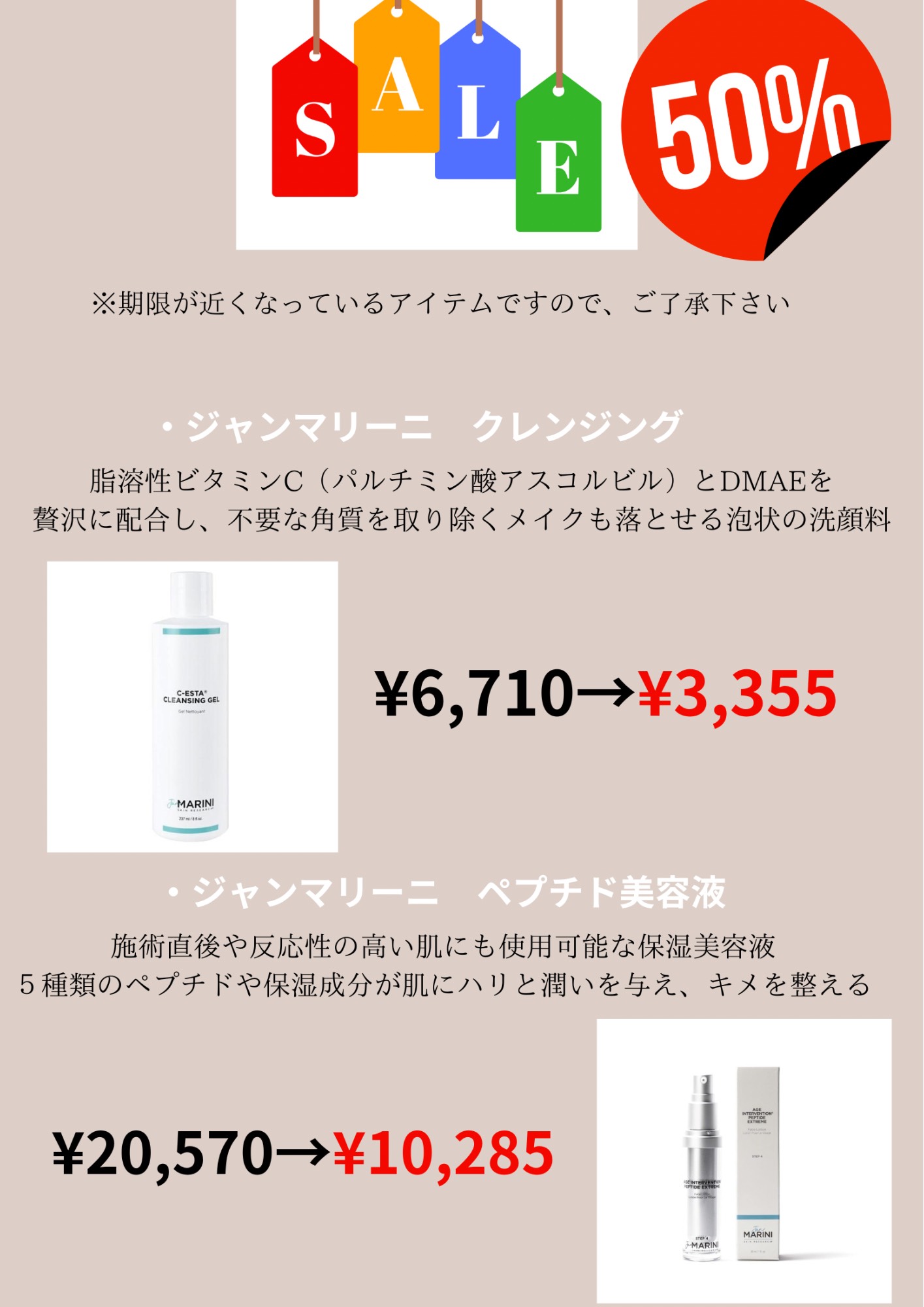 期限が近くなっているアイテムが50%オフとなります。