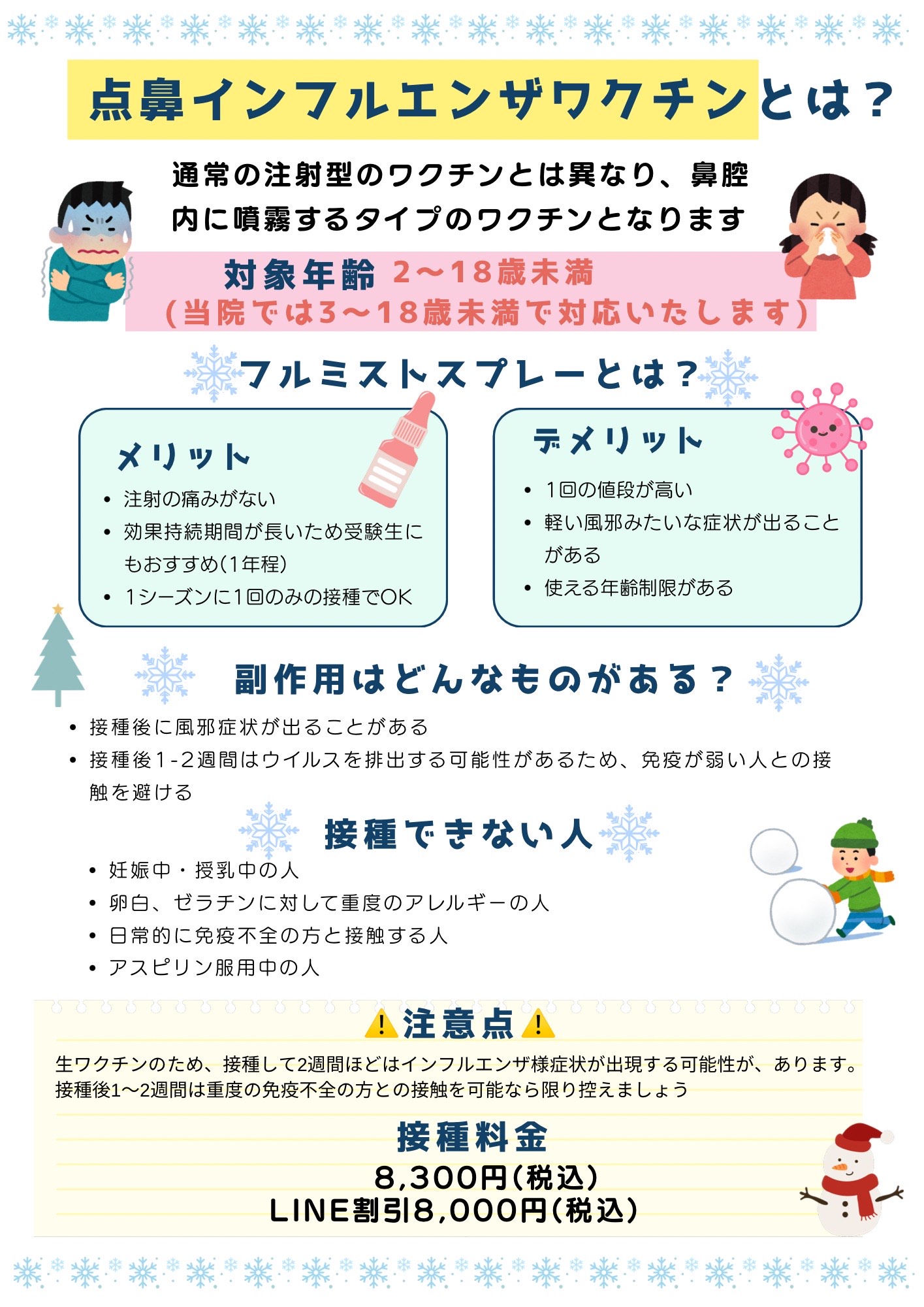 ・発熱・鼻水が強い日は接種を見合わせることもございます ※卵アレルギーのある方、喘息など呼吸器症状のある方は接種できない場合があります。
