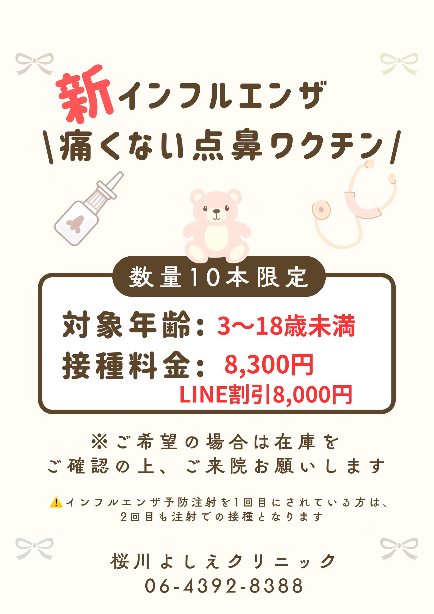 インフルエンザ点鼻ワクチン入荷のお知らせ - 桜川よしえクリニック | 難波・桜川の皮膚科