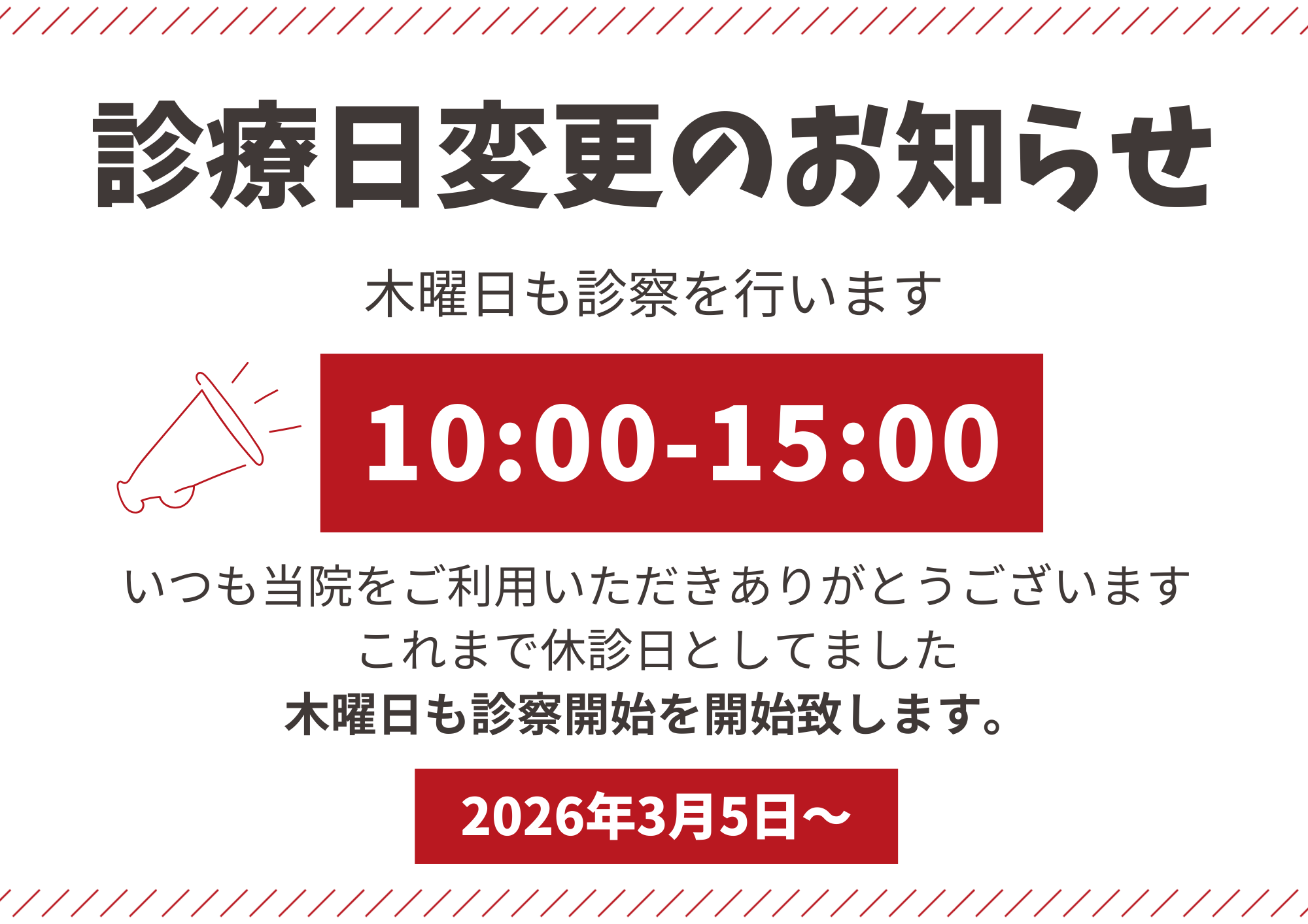 3月より木曜日の診察を始めます。 診察時間は10:00~15:00です。 受付開始は9:45からになります。 よろしくお願いいたします。